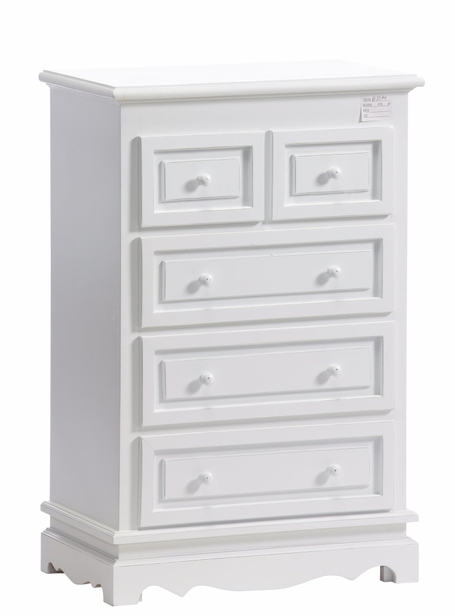 Denna vita byrå med fem lådor är en praktisk och stilren förvaringsmöbel som passar perfekt i sovrum, hall eller vardagsrum. Med två mindre lådor upptill och tre större lådor nedtill erbjuder byrån gott om utrymme för kläder, underkläder, accessoarer och andra vardagsföremål.