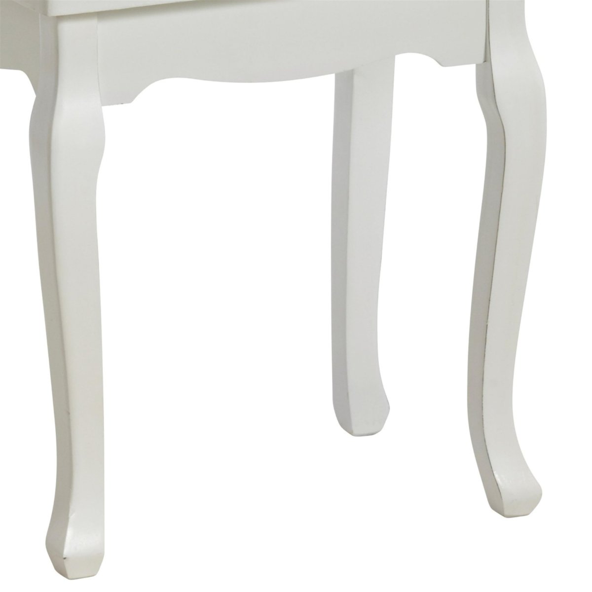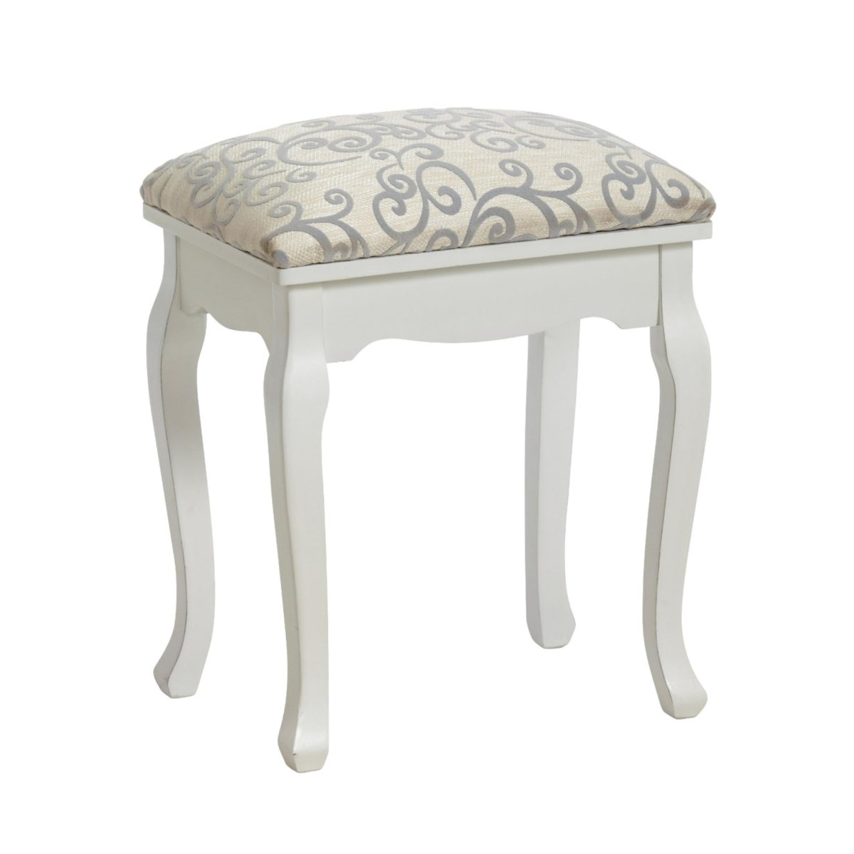 Pall med trä ben vit målad. Dynan är i mönstrad klädsel i vitt samt grått.