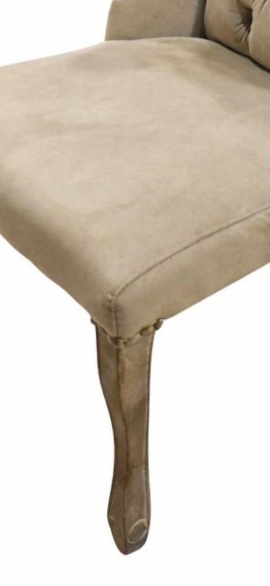 Denna exklusiva stol kombinerar tidlös elegans med hög komfort. Stolen är klädd i ett beigt sammets tyg med vackert djuphäftad rygg som ger ett sofistikerat och klassiskt uttryck. De höga sidorna i ryggen ger extra stöd och skapar en ombonad känsla, perfekt för långa middagar eller som accentstol i vardagsrum och arbetsrum.